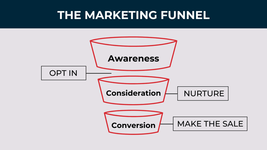 To fully see where email marketing fits in a strategy, let’s break down the marketing funnel. Marketing funnels consist of four main stages: Awareness, Opt-In, Consideration, and Conversion.