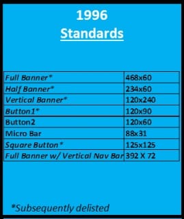 In 1996, the first set of online display advertising standards were released. They included eight set sizes and looked something like this.