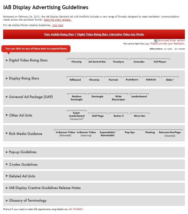What started out as eight standards in 1996 has grown to include over 33 different creative standards across multiple platforms. It is estimated that over 80% of display ads currently sold follow IAB standards. Today, if you click on the Display Advertising Guidelines under the Guidelines & Best Practices tab on IAB’s website, you will see something like this.