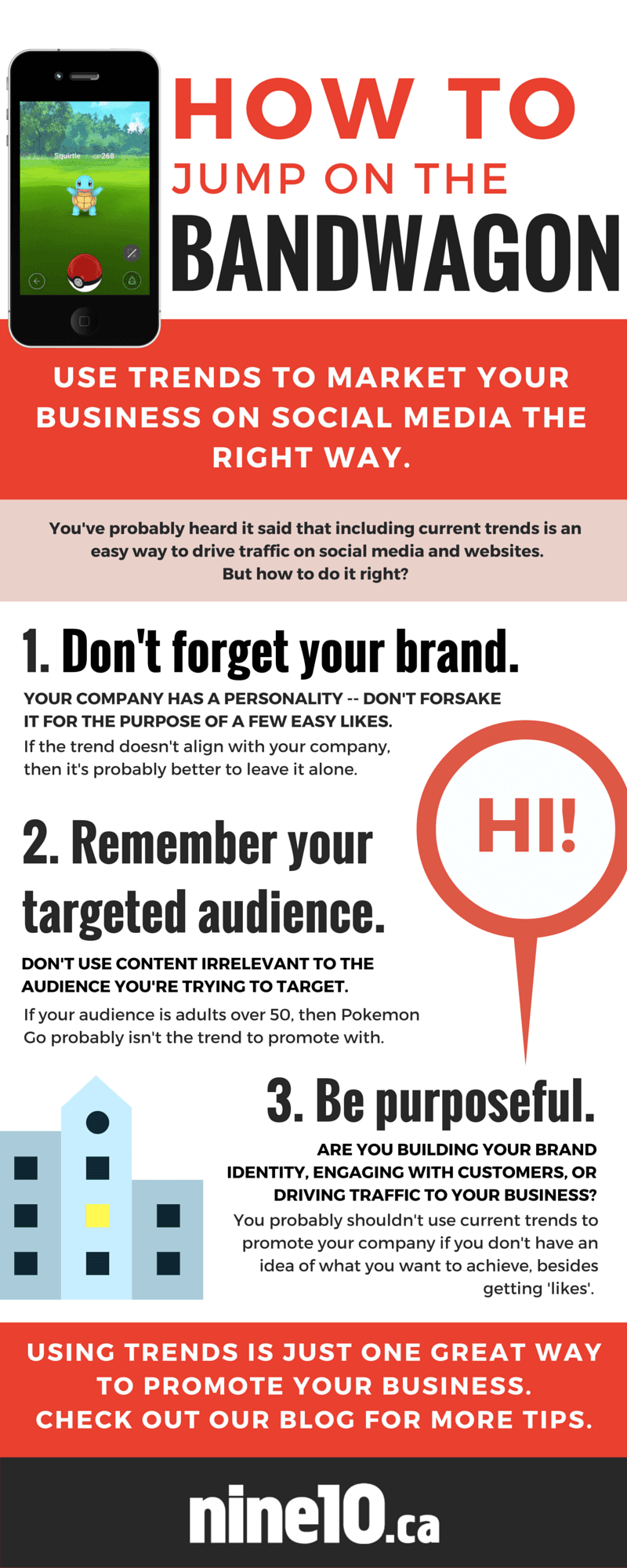 Integrating trending topics into your business’s social media posts is a great way of increasing traffic. But are you sacrificing the quality of your brand for more views? Take a look at this infographic created by myself, Kendra the awesome intern, for three tips on how to use trends the right way.